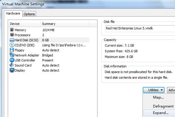 By default installation, linux virtual machine (Fedora, RHEL or CentOS) has two partitions, one for swapping, and the other one is a lv partition. The lvm partition mount as /, and cannot be resized by partition tools such as partition magic or gparted.
