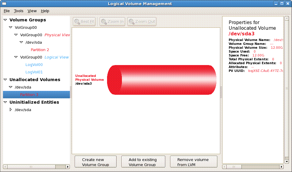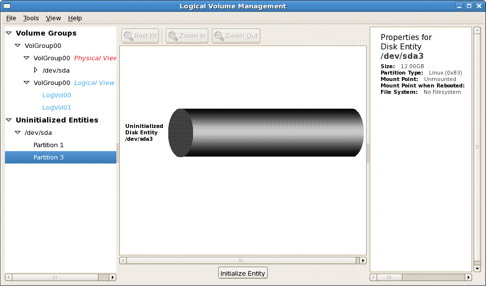 Launch system-config-lvm, as in the following image, select "Partition 3" under the "Uninitialized Entities", then press "Initialize Entity" button to initialize it.