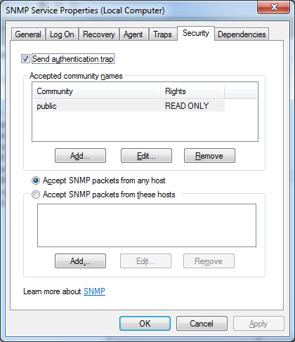 Open "Service/SNMP", select "Security" tab, make sure there is at least one community name. If other hosts need to access this SNMP service, check "Accept SNMP packets from any host".