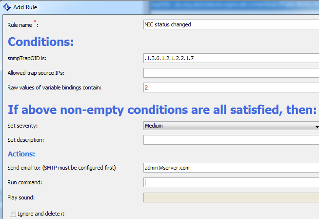 All rules will be applied for an incoming trap, except that a rule specifies that the trap should be ignored. Rules are ordered by their names. So you can modify rule's name to change its execution order. For example, rule A and B have the same conditions, but A sets severity to low and B sets severity to medium. Because B is applied after A, the final severity will be set to medium.