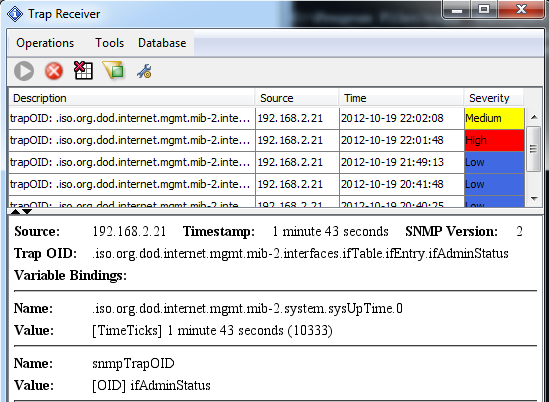 Trap receiver window is divided into two panels. The upper panel displays summaries of traps. The lower panel displays details of selected trap.
