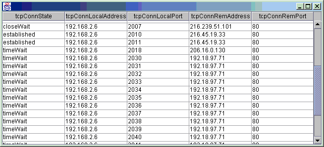 /* * Copyright (c) 2002 iReasoning Networks. All Rights Reserved. * * This SOURCE CODE FILE, which has been provided by iReasoning Networks as part * of an iReasoning Software product for use ONLY by licensed users of the product, * includes CONFIDENTIAL and PROPRIETARY information of iReasoning Networks. * * USE OF THIS SOFTWARE IS GOVERNED BY THE TERMS AND CONDITIONS * OF THE LICENSE STATEMENT AND LIMITED WARRANTY FURNISHED WITH * THE PRODUCT. * * IN PARTICULAR, YOU WILL INDEMNIFY AND HOLD IREASONING SOFTWARE, ITS * RELATED COMPANIES AND ITS SUPPLIERS, HARMLESS FROM AND AGAINST ANY * CLAIMS OR LIABILITIES ARISING OUT OF THE USE, REPRODUCTION, OR * DISTRIBUTION OF YOUR PROGRAMS, INCLUDING ANY CLAIMS OR LIABILITIES * ARISING OUT OF OR RESULTING FROM THE USE, MODIFICATION, OR * DISTRIBUTION OF PROGRAMS OR FILES CREATED FROM, BASED ON, AND/OR * DERIVED FROM THIS SOURCE CODE FILE. */ import com.ireasoning.protocol.snmp.*; import javax.swing.*; import javax.swing.table.*; /** * This class demonstrates retrieving SNMP table and polling table periodically. * <pre> * Example: * java snmpgettable localhost tcpConnTable * java snmpgettable localhost iftable * java snmpgettable localhost ifTable * java snmpgettable -o localhost ipRouteTable * </pre> * * Example Result:java snmpgettable localhost tcpConnTable